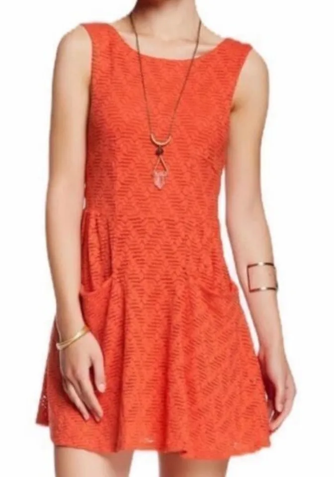 Fit and flare mini dress. Textured stretchy material. Back cutout with button detail. Scoop neck. Tw... Show more