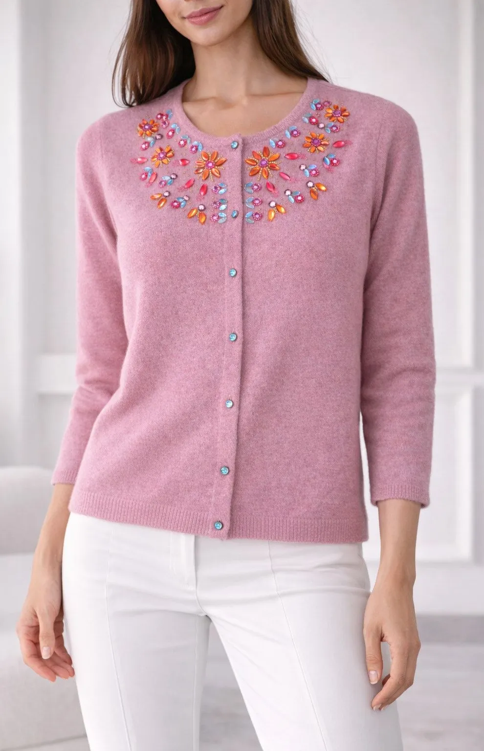 This beautifully crafted dusty rose cardigan combines soft luxury with eye-catching detail. Made fro... Show more