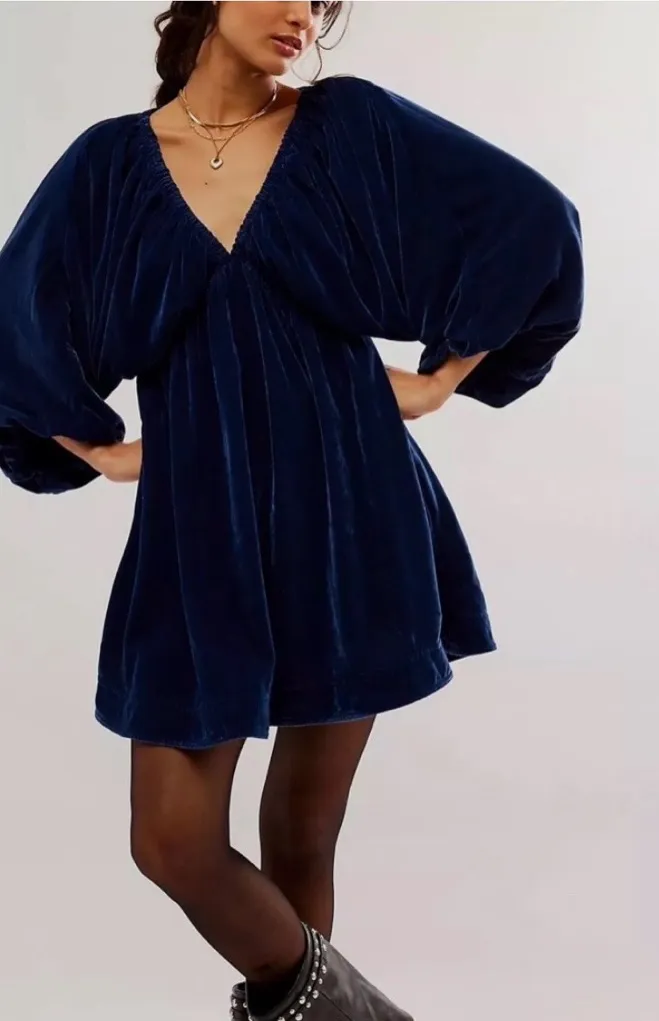 Chic mini dress with a deep V-neckline. Voluminous sleeves add flair. Perfect for a stylish outing.... Show more