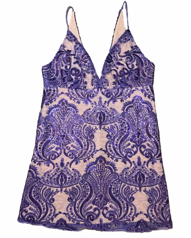 Beautiful purple lace dress with intricate patterns and sequins . Ideal for special events. Thin spa... Show more