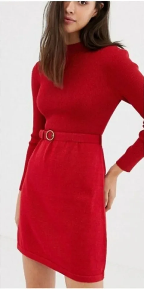 Free People red French Girl dress Belted Mock neck Long sleeves Rib knit fabric Sparkl... Show more