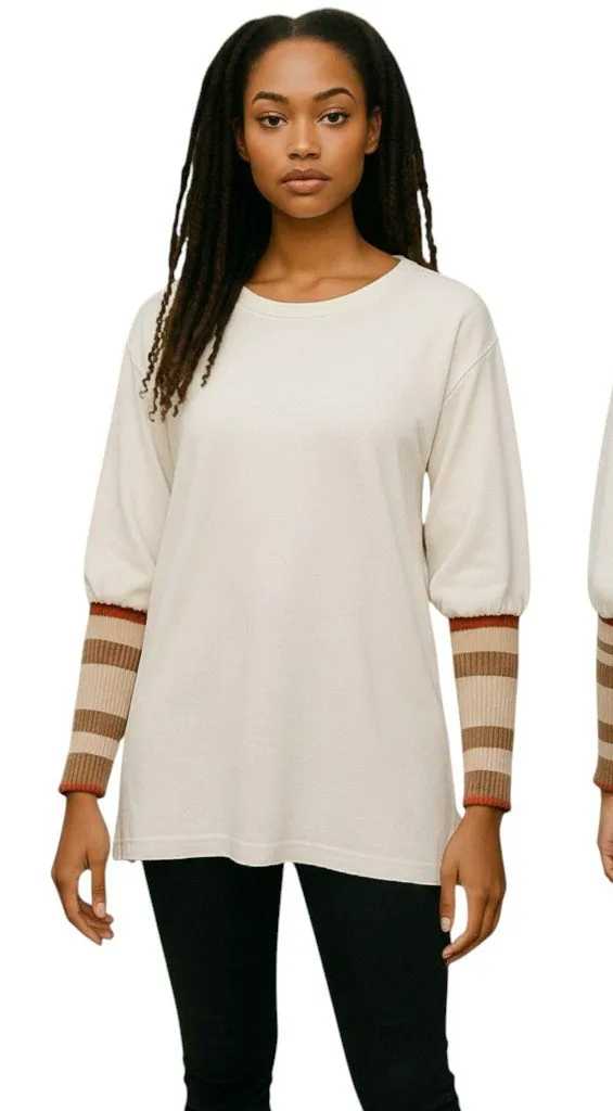 Item: Free People Ribbed Cuff Long Sleeve Top, Size M Color: Cream with rust/tan/beige striped cuffs... Show more