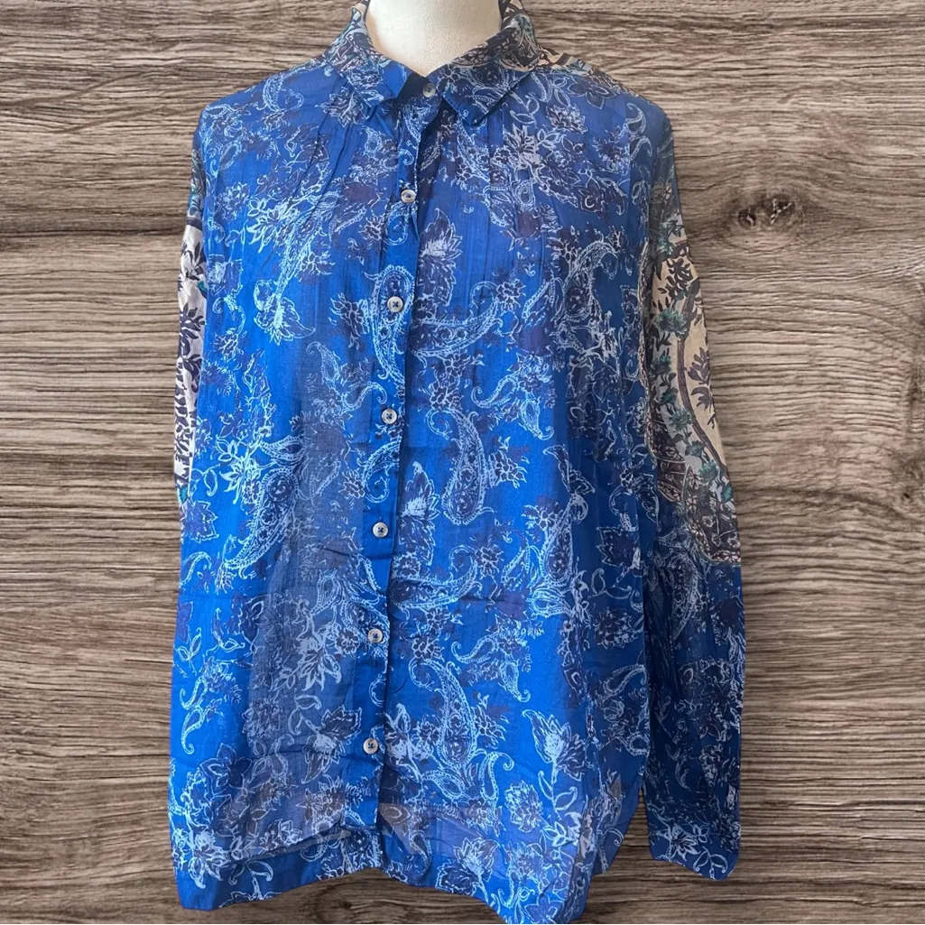 This Free People blouse showcases a stunning royal blue hue with a delicate lace-like texture that a... Show more