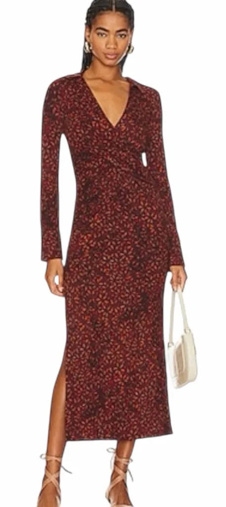 Details • Long sleeve maxi dress with a faux wrap-style front • Deep V neckline for a flattering,... Show more