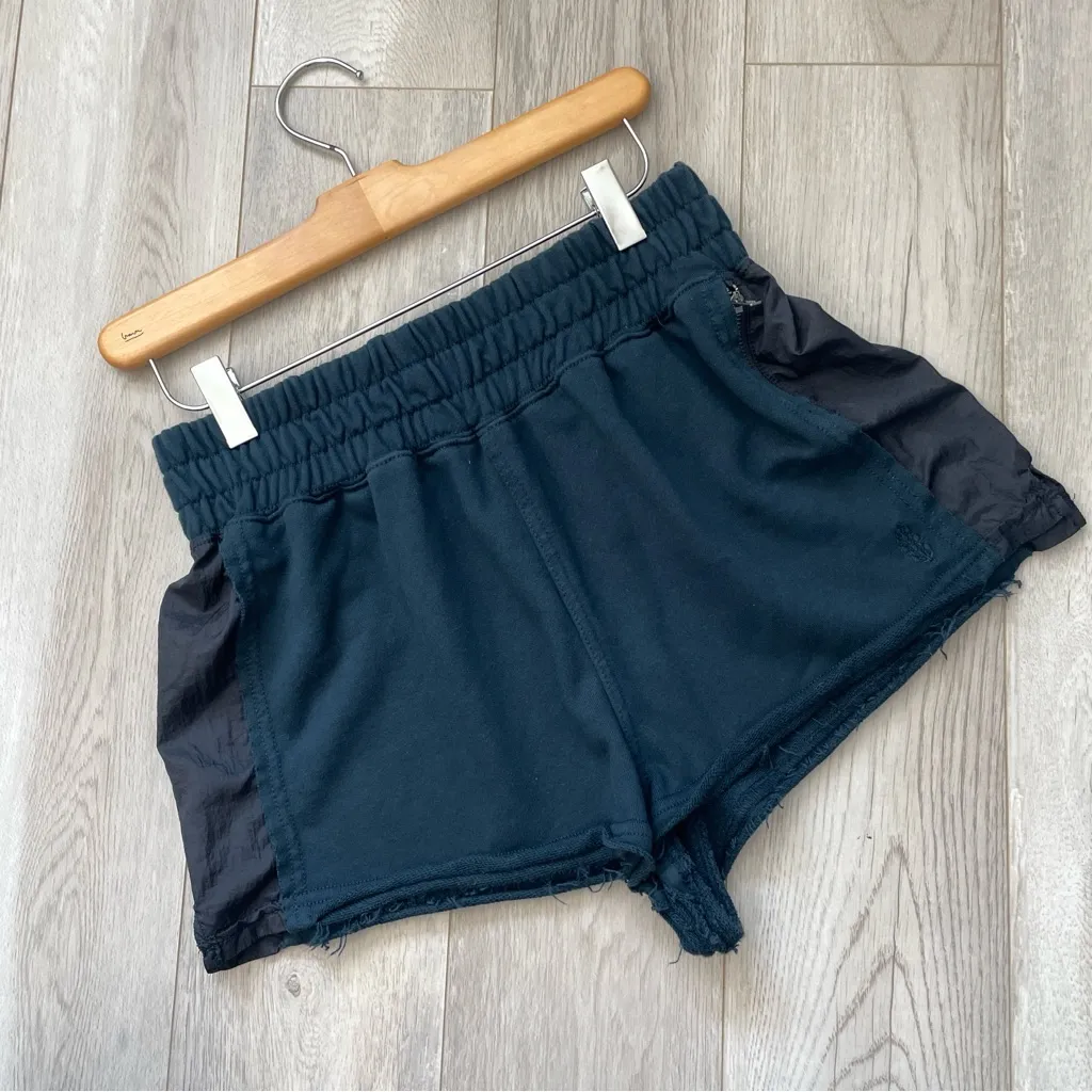 Free People Cotton Sweat Shorts in the color navy blue. Elastic waistband, FP logo embroidered on fr... Show more