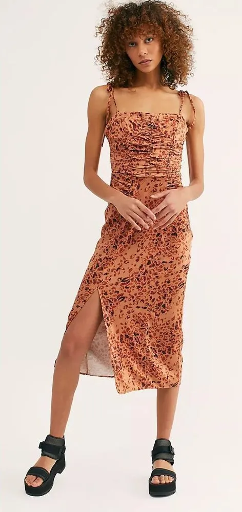 FREE PEOPLE Show Stopper Midi Dress Animal Print Sz XS Rust brown colored midi dress - animal print.... Show more