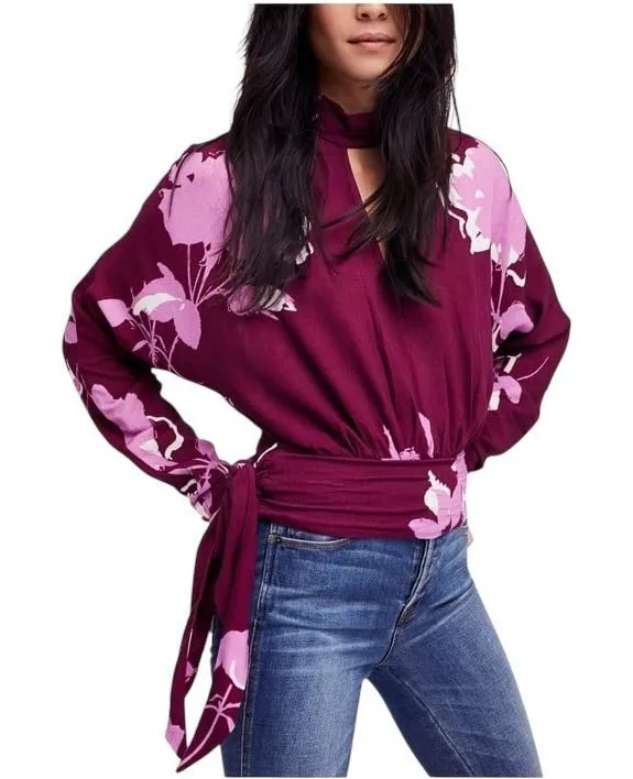 Free People Small Top Burgundy Floral Mock Neck Long Sleeve Choker V Neck 1043 Chest: 18” across Le... Show more
