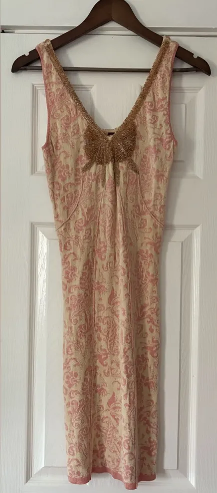 Chic sleeveless dress with a pink and cream pattern. Features a stylish beaded neckline.