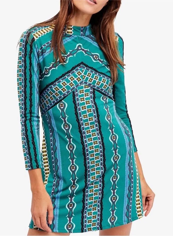 Women’s size small Free People Stella long sleeve mini dress. High neckline, zips in the back. Teal... Show more