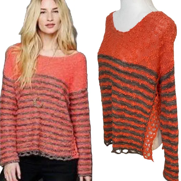 Free People Sweater Striped Crochet Knit Boatneck Cotton Long Sleeve Coral XS Condition: Very good-... Show more