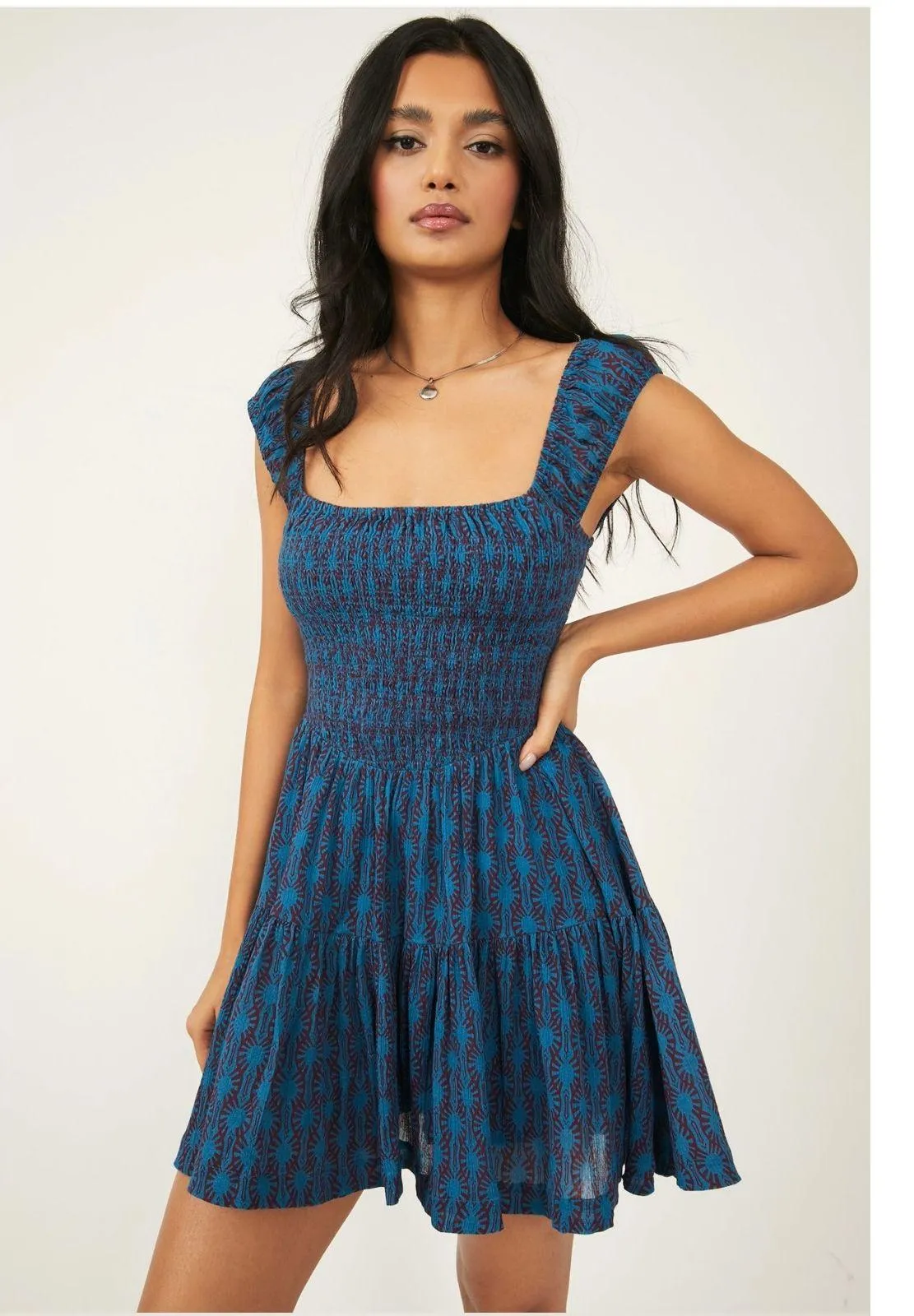 Keywords: Free People, Mini Dress, Blue Dress, Brown Dress, Smocked Dress, Tiered Dress, Square Neck Dress, Womens Dress, Bohemian Dress, Casual Dress, Summer Dress, Printed Dress