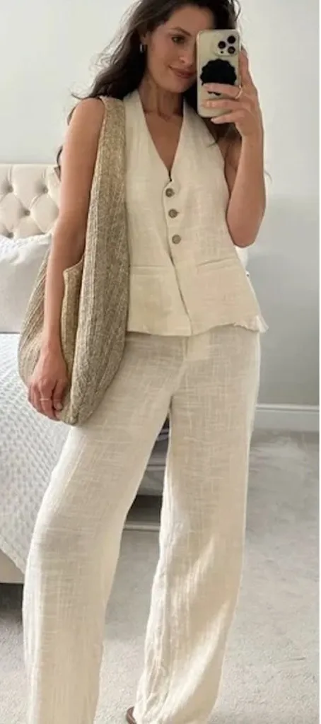 Details: – Vest has front button closure; ties at neck and back; front welt pockets – Pants have ela... Show more