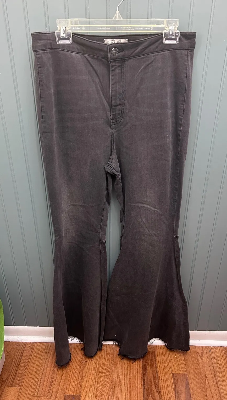 Embrace a retro vibe with these Free People charcoal grey flare jeans. Designed to flatter, these jeans feature a dramatic flare that creates a striking silhouette from hip to hem. The rich charcoal wash offers a versatile look, perfect for dressing up or down. The high-rise waist ensures a comfortable and secure fit, while the flared legs add a touch of vintage flair. These jeans are ideal for a concert, a casual day out exploring, or a fun night with friends.