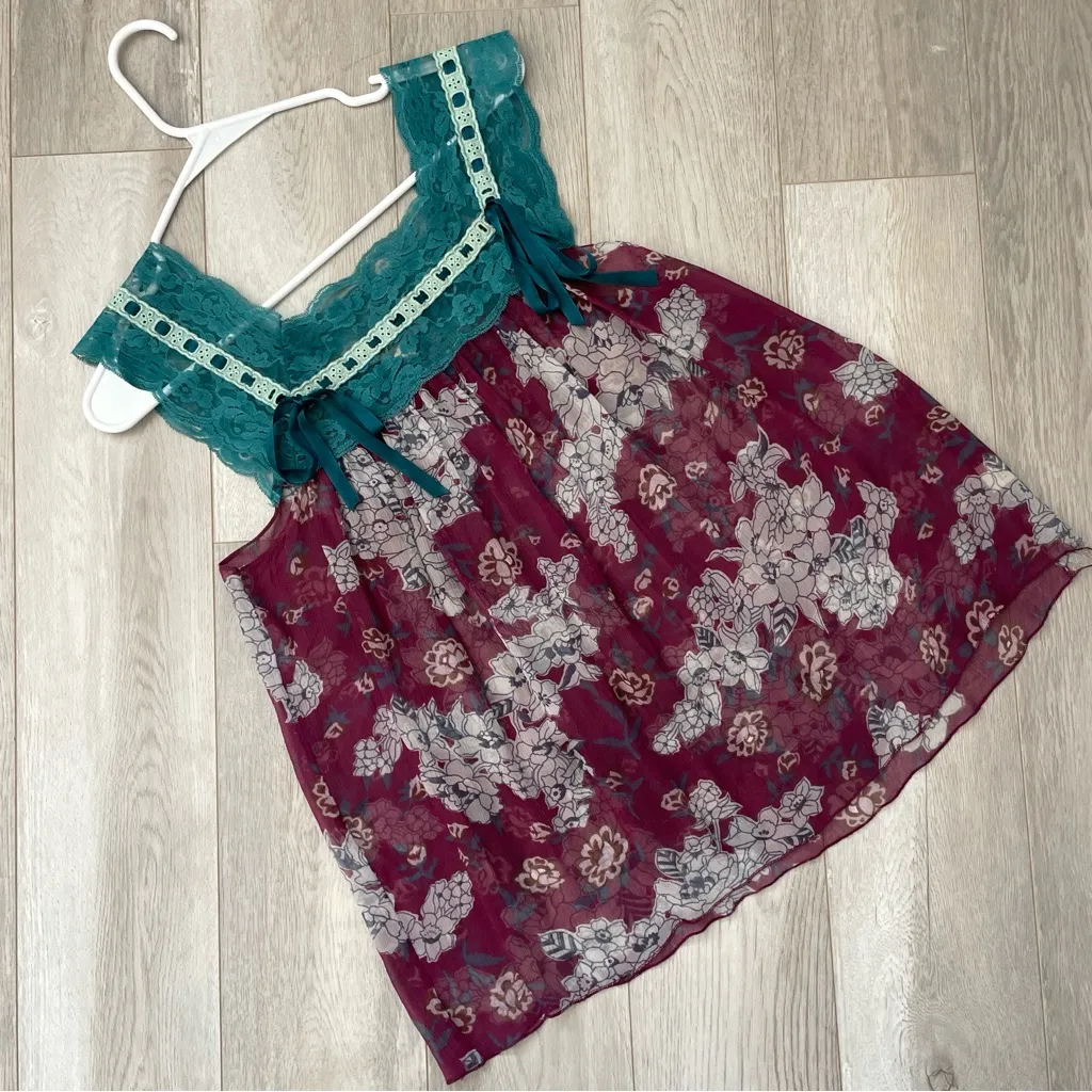 Free People Silk Floral Top in the color Purple and Teal. Square neckline, wide straps with lace and... Show more