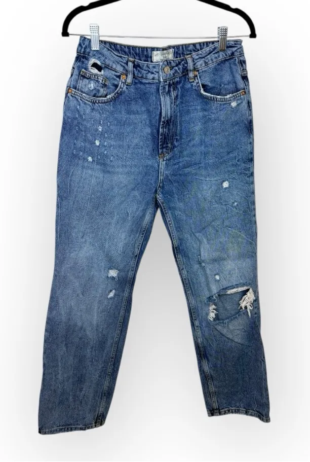 Free People “We The Free” distressed straight-leg jeans in a medium vintage wash with heavy fraying,... Show more