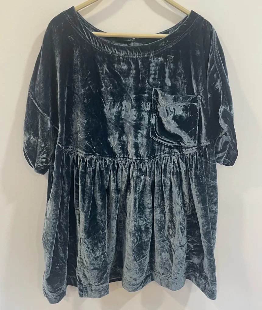 Elegant velvet blouse in rich blue. Features a stylish front pocket and gathered waist. NWT SZ Medi... Show more