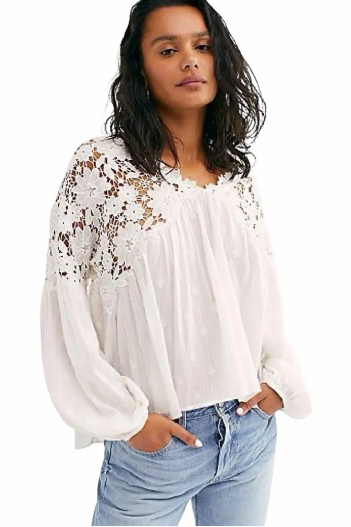 Features a floral crochet bodice with a Swiss dot print Puff sleeves with a gathered cuff PLEASE N... Show more