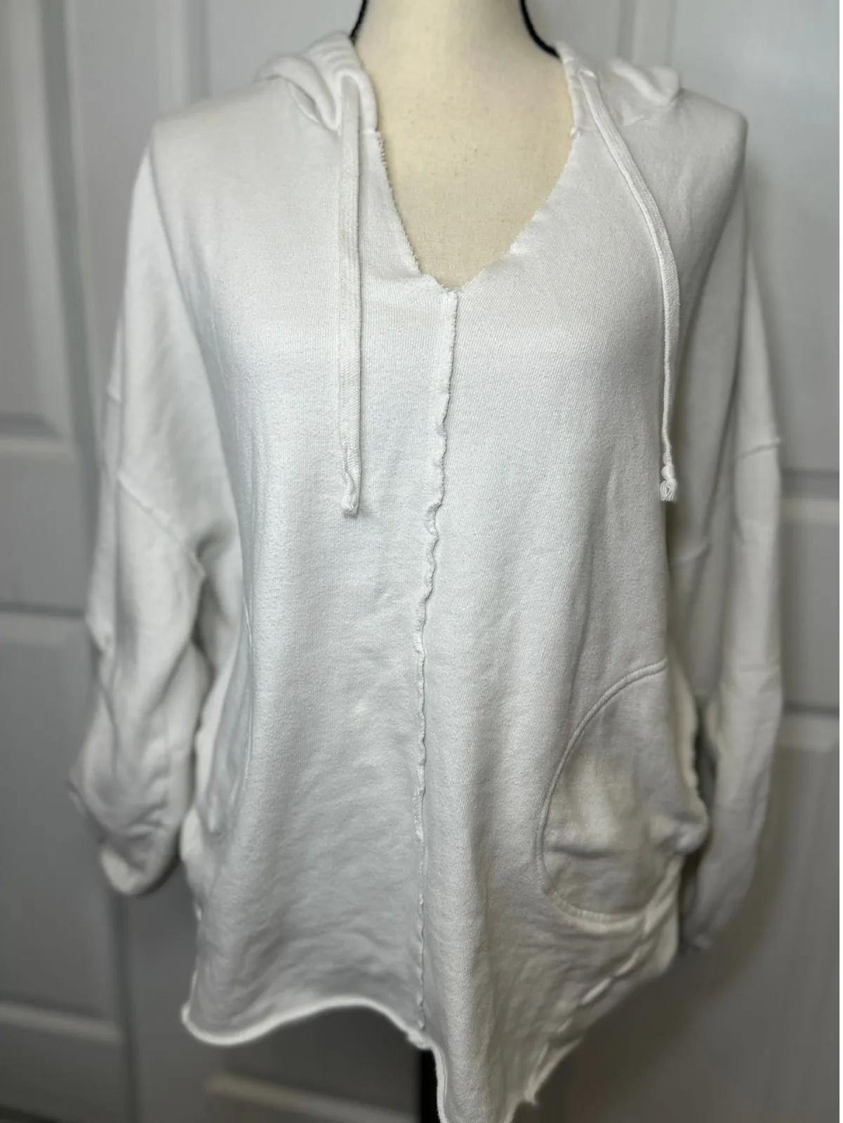 Cozy and stylish Free People hoodie in soft white cotton with unique raw seam detailing down the fro... Show more
