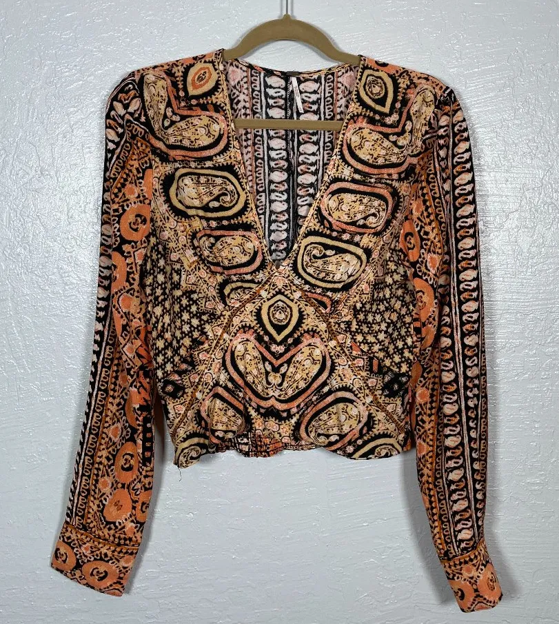 Free People Women S Orange, Yellow, and Black Wild and Free Blouse Long Sleeve, deep v-neck, smoc... Show more