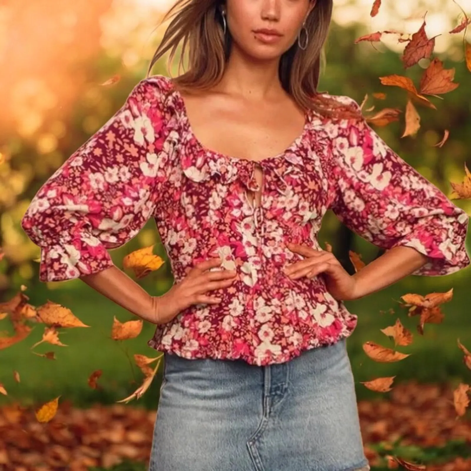 Free People Womens Blouse Size S Sweet Memories 3/4 Sleeve Orange & Pink Floral GENERALLY SHIP SAME... Show more