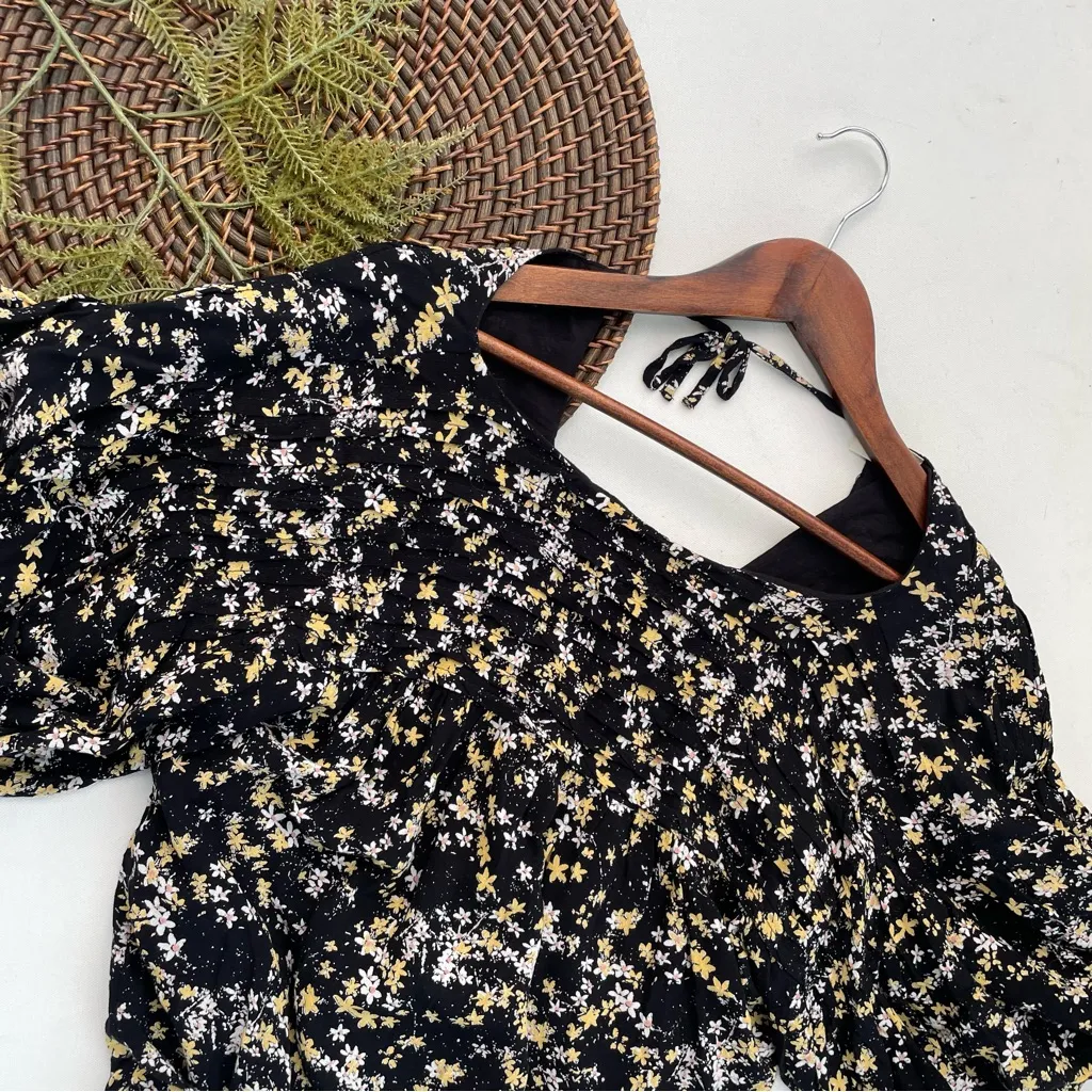 Womens Size XS Bodysuit Black Yellow White Floral Puff Sleeve Tie Back Good Pre Owned Condition N... Show more