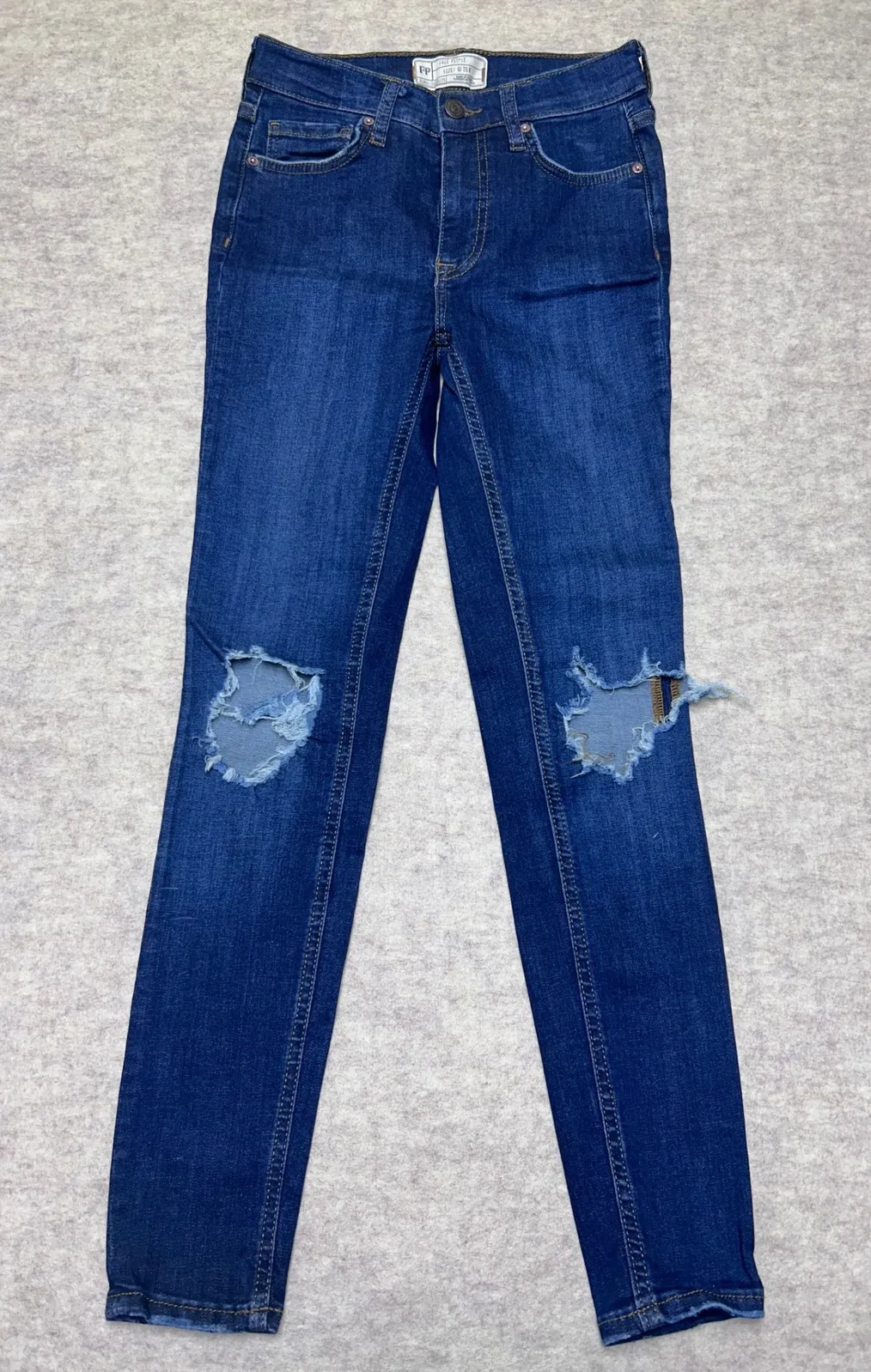 Keywords: Free People jeans, womens jeans, dark wash jeans, distressed jeans, ripped knee jeans, skinny jeans, size 25 jeans, casual jeans, denim pants, stylish jeans, womens denim, Free People, Ripped jeans women