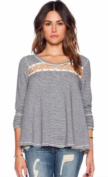 This Free People boho-chic top is the perfect blend of casual and statement style. Crafted from a soft cotton blend, this relaxed-fit, long-sleeve top features a heathered gray knit fabric with a unique open-lattice lace-up neckline that adds a flirty touch. The flowy silhouette and raw-edge hem give it a laid-back, vintage-inspired vibe, making it an effortless layering piece. Pair it with distressed denim for the ultimate free-spirited, off-duty look. Keywords & Core Aesthetics: Free People top, boho chic, lace-up neckline, relaxed fit, flowy silhouette, distressed hem, casual fashion, effortless style, indie aesthetic, festival fashion, cozy knit, vintage-inspired, soft grunge, laid-back layering piece, everyday wear Condition: Excellent Used Condition Materials: 78% Cotton, 20% Polyester, 2% Spandex Measurements: Pit to Pit 19" Sleeve Length 24" Length 24"