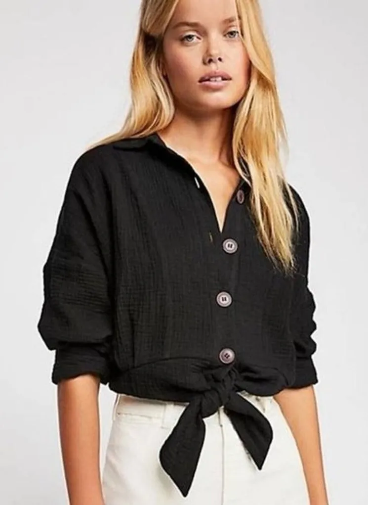 Stylish black button-down shirt. Features a tie-front design. Perfect for casual wear. Item number... Show more