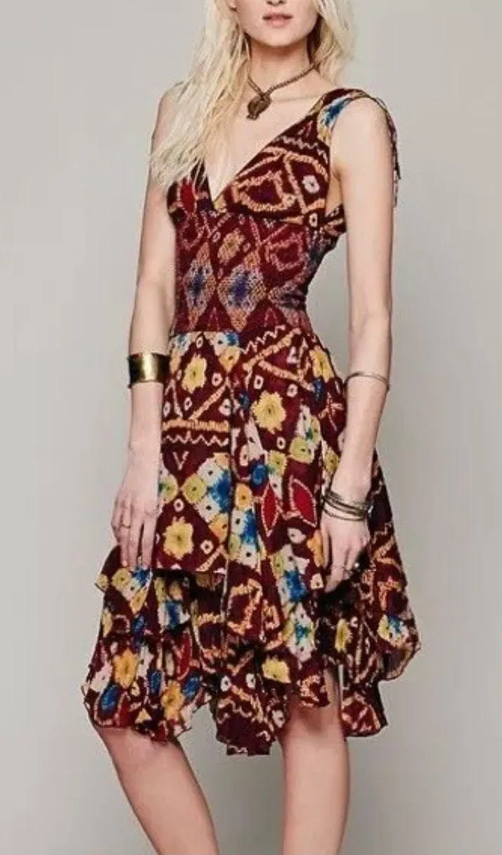 WORN ONCE FREE PEOPLE WISTERIA LATTICE SMOCKED WAIST BANDHANI PRINT MIDI DRESS. MINT. SZ S