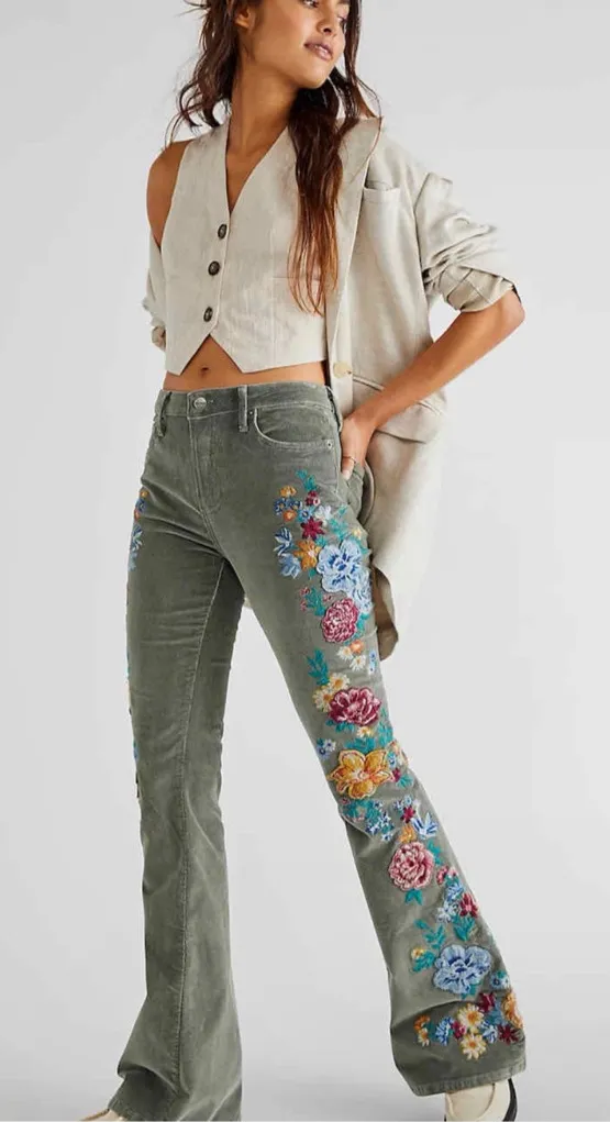 EUC Sold by Free People: Beautiful Driftwood Farrah Embroidered Corduroys "Green Rose" in size 27. Cool in corduroy, these forever-favorite jeans from Driftwood are featured in a mid-rise, flare silhouette with statement floral embroidery at the sides for a femme finishing touch. Zip-fly and button-closure, five pocket design, soft and stretchy fit. Color is more like in stock photos, looks lighter in my pictures. Excellent condition. Please see pictures for details, fabric content, condition & measurements. Sold out in Stores. Approx. measurements: Waist: 14-3/4" Front Rise: 9" Back Rise: 12-1/4" Leg Opening Thigh: 10" Leg Opening Hem: 12" Inseam: 32-1/2" Outseam: 41-1/2" Y2K, sundress, Summer, spring, striped,,, 70s, 80s, 90s, boho, bohemian, lightweight, airy, breezy, date, brunch, hollywood, celebrity, melrose, sustainable, eco-conscious, eco-friendly, fitted, a-line, fit & flare spring, retro, midi, thigh split, velvet, stretch, flattering, feminine, flirty, fitted, curvy, dual chromatic, forest, Lace, Sparkle, Neck, Frill, Romantic, Bardot, Travel, Blogger, Party, airy, bow, highwater, crop, high end, silk, runway, New Years, holidays party dress, night out, date night, ladies night, hippie, concert, hipster, music festival, fringes, embroidery, urban outfitters, cowboy, western, tassles, Anthropologie, deep V neck, ulla Johnson, Anine bing, free people, western, cowboy, vintage, rocker, motorcycle, metallic