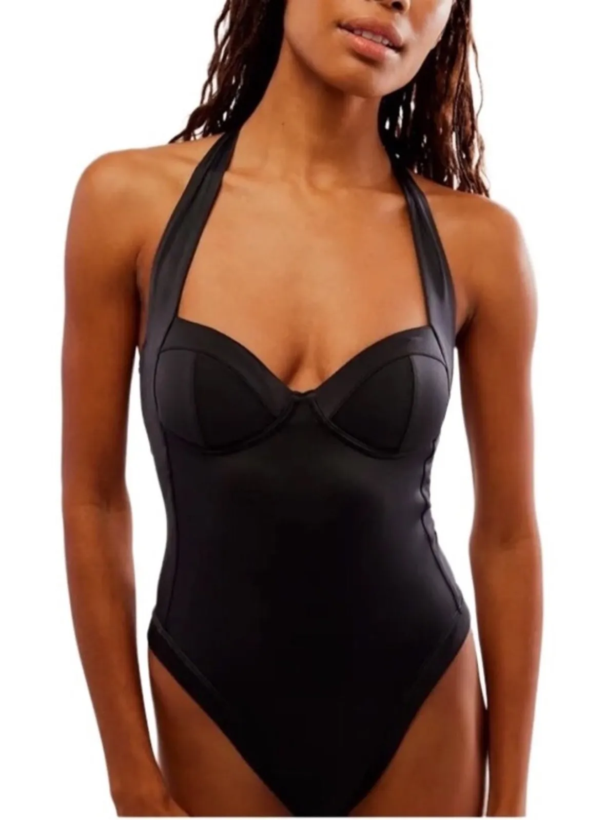 Size Large. NWT Noir Black Pull Thru Bodysuit / Swimsuit by We Are HAH. - Solid black color - Flattering and femme beautiful bodysuit - Sleek silhouette - Buttery soft fabrication - Sweetheart neckline with corset-inspired detail - Adjustable ties at the neck and back - Pull-on style - Cheeky bottom - Ruching at back - High cut legs - Swim-style fabric with smooth finish - This versatile bodysuit can also be worn as a one-piece swimsuit during your next trip to the beach - Sustainably-made fabric derived from corn sugar - Machine wash cold - 83% Polytrimethylene Terephthalate / 17% Lycra - Style #21525 Brand new with tags in original packaging!
