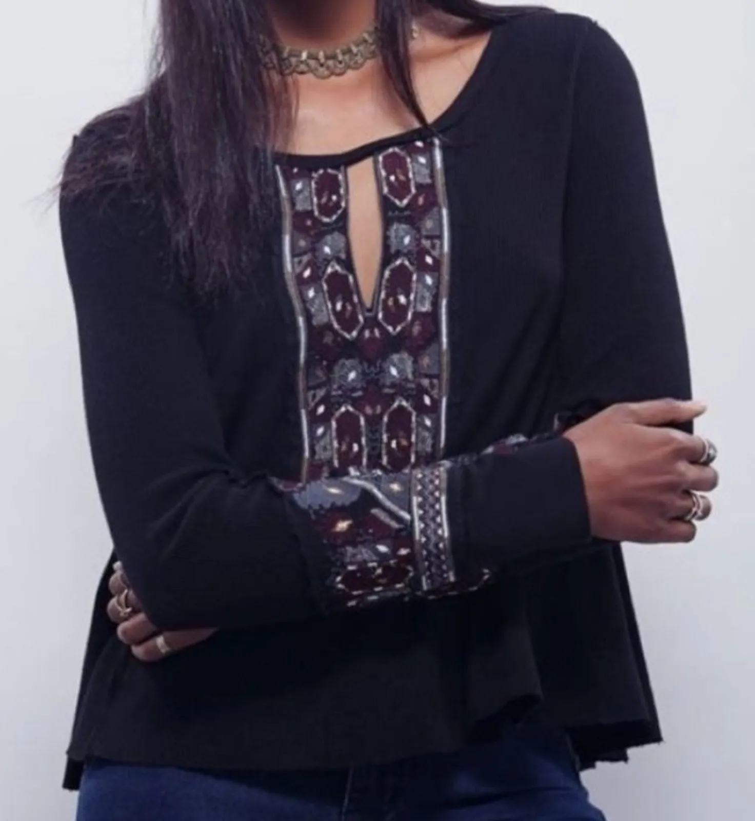 Free People x Marion Black Burgundy Embroidered Waffle Knit Thermal Top Size XS oversized Gorgeous... Show more