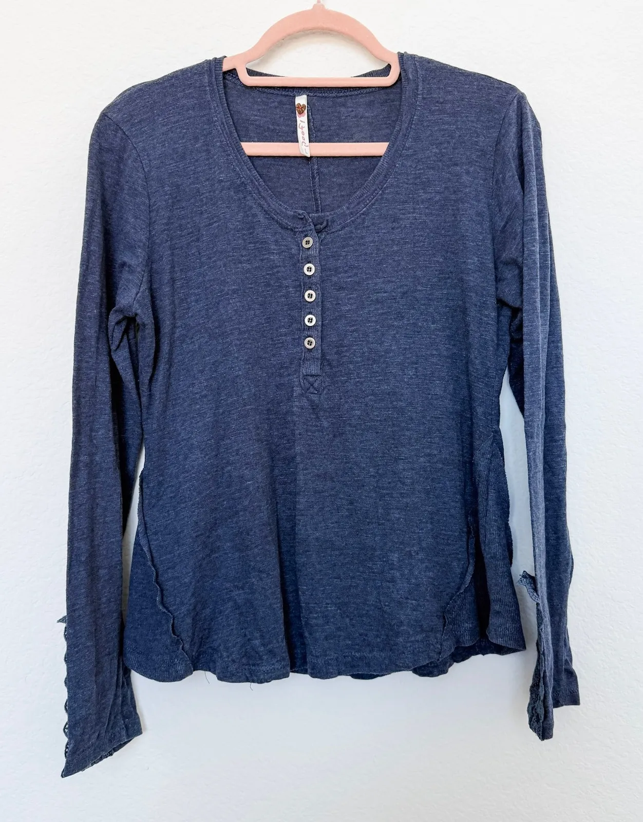 A versatile blue long sleeve henley top with intricate lace detailing on the cuffs. This comfortable... Show more