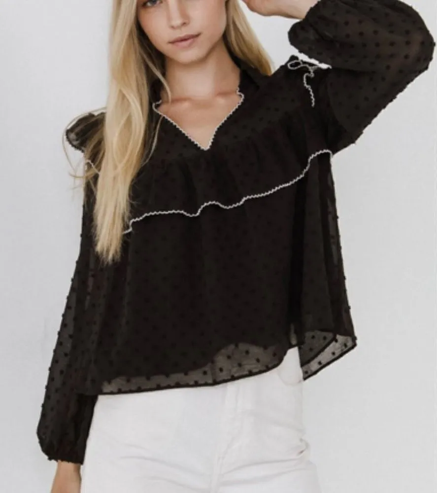 Brand: Free the roses Type: black Swiss dot ruffled blouse Color: black with white trim Condition: new with 🏷️ Material: polyester Size: medium Description: adorable semi sheer Swiss dot blouse with ruffled bib front Measurements: Pit to pit: 18.5” Length: 22” Bundle and save ❤️ *All measurements are approximate and taken in lay down format.