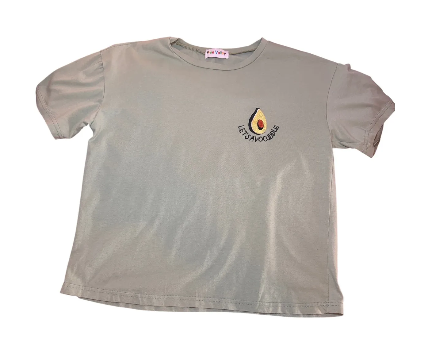 Embrace playful charm with this adorable Free Valley t-shirt. The soft light green fabric provides a comfortable canvas for the delightful embroidered avocado graphic and the witty "Lets Avocuddle" text, promising a cozy and cheerful addition to your wardrobe. Perfect for casual outings, relaxing at home, or sharing a smile with friends. Measurements: • Length: 20.5 in • Chest Pit to Pit: 18.5 in Type: T-Shirt Department: Women Style: Basic Neckline: Crew Neck Sleeve Length: Short Sleeve Sleeve Type: Classic/Fitted Sleeve Pattern: Solid Accents: Embroidered Features: Lightweight Fit: Regular Fabric Type: Knit Occasion: Casual Closure: Pullover Season: Summer, Spring Condition: Excellent preowned condition with no flaws. There is no size or material tag. Please see measurements to ensure fit. Keywords: graphic tee, embroidered, avocado, cute, casual, streetwear, quirky, fun, whimsical, everyday wear, summer, spring, tiktok fashion