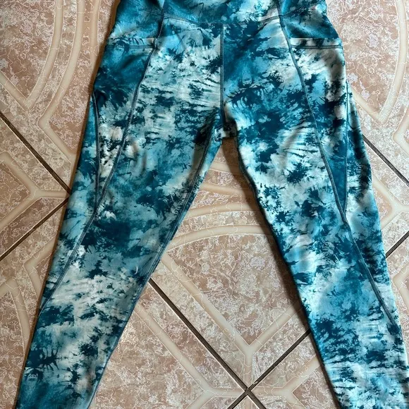 These leggings feature a captivating tie-dye pattern in blue and white, offering a unique and vibrant look. Crafted from a performance fabric blend, they provide a comfortable and form-fitting silhouette that extends to the ankles. Perfect for both casual wear and athletic activities, these leggings combine style and functionality effortlessly. No flaws, excellent condition.