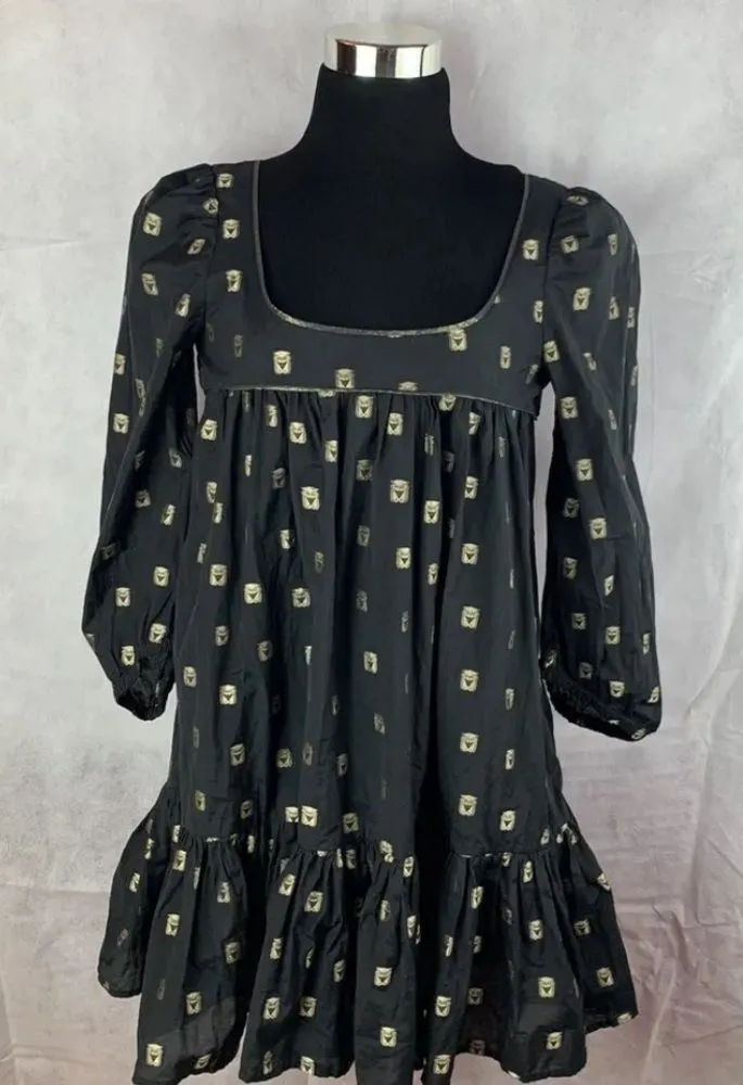 Excellent used condition French Connection babydoll ruffle dress in black and gold with owl bird det... Show more