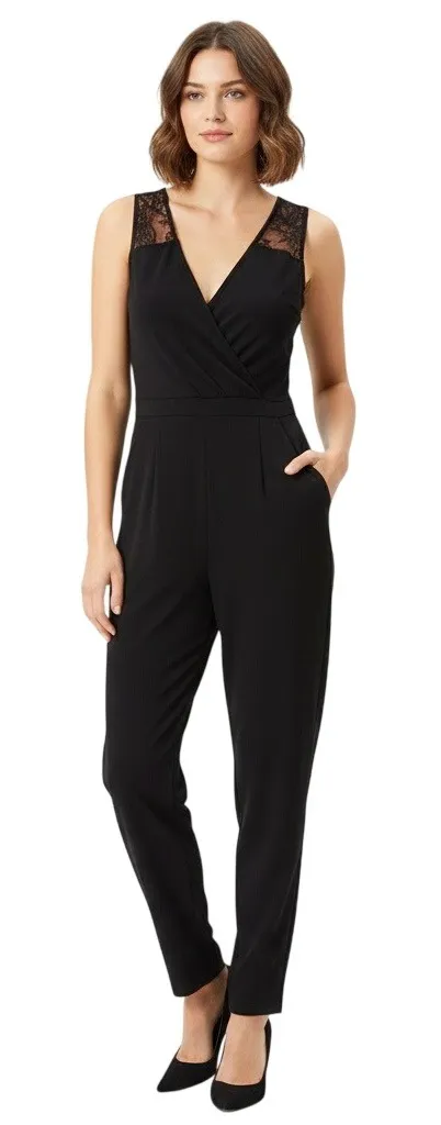 Black French Connection sleeveless jumpsuit with delicate lace detailing at the neckline and a flatt... Show more