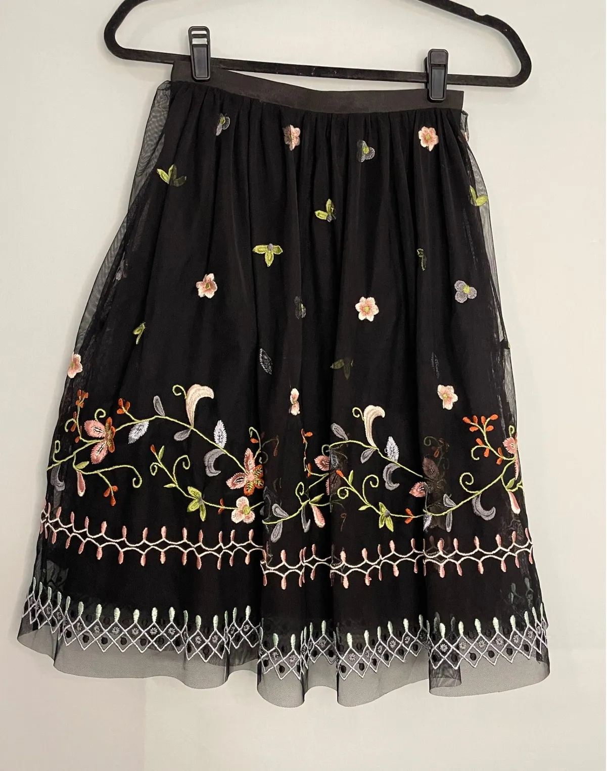 Black tulle midi skirt with allover embroidered floral and leaf motifs. Features a delicate embroide... Show more