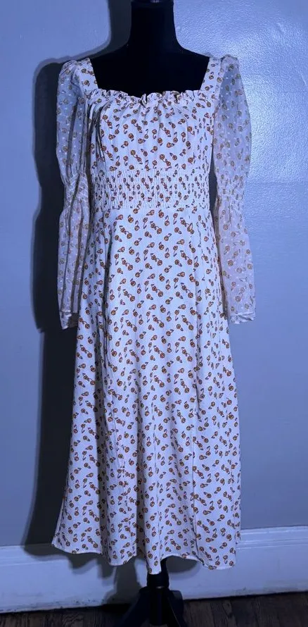 Charming white dress with orange floral pattern. Features smocked waist and sheer long sleeves. Perf... Show more