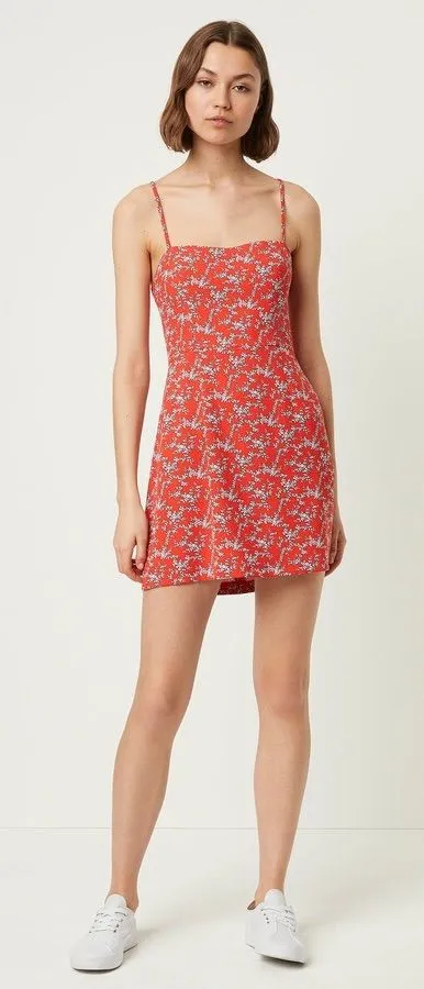 Chic red mini dress with floral pattern. Perfect for summer outings. Feminine, floral, holiday red,... Show more
