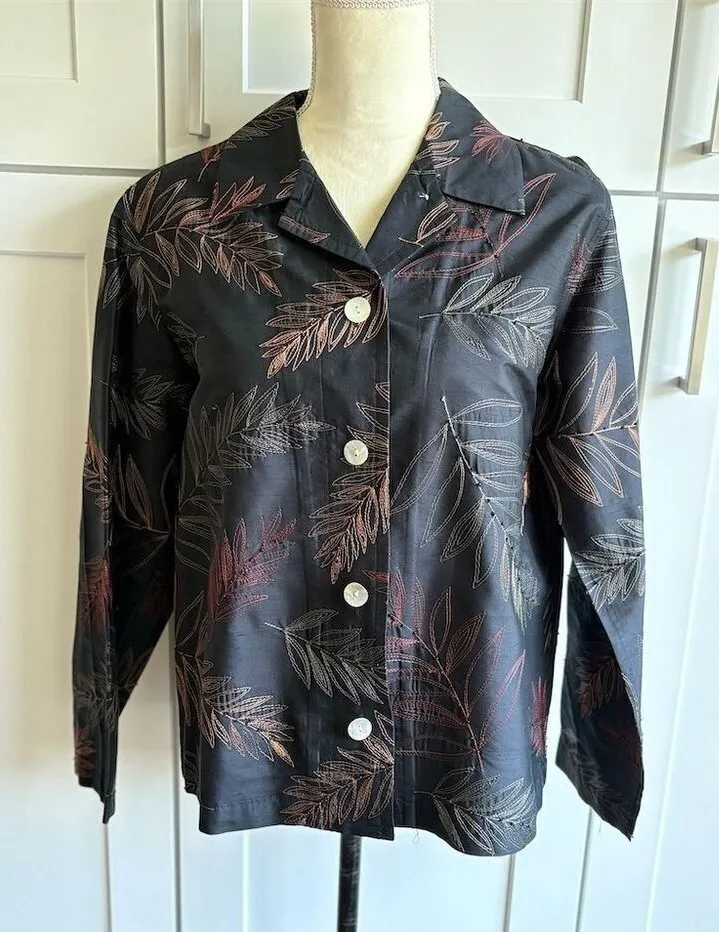This French Laundry blazer is a versatile piece for women, crafted from silk with a rayon lining. It features a geometric pattern in black, accented with beading, and has a button-up front with a tailored collar. The mid-length jacket is suitable for both business and casual occasions, making it ideal for fall and spring. Designed with long sleeves, it requires dry cleaning and is made in China. The blazer is excellent pre-owned condition. Brand: French Laundry Type: Blazer Size: M Outer shell material: Silk Style: Basic Jacket Department: Women Color: Black Lining material: Rayon Theme: Career, Casual Accents: Beaded Features: Button-up front, Tailored collar Pattern: Geometric Jacket/coat length: Mid-Length Season: Fall, Spring Closure: Button Occasion: Business, Casual Country/region of manufacture: China Sleeve length: Long Sleeve Garment care: Dry Clean Only Measurements upon request