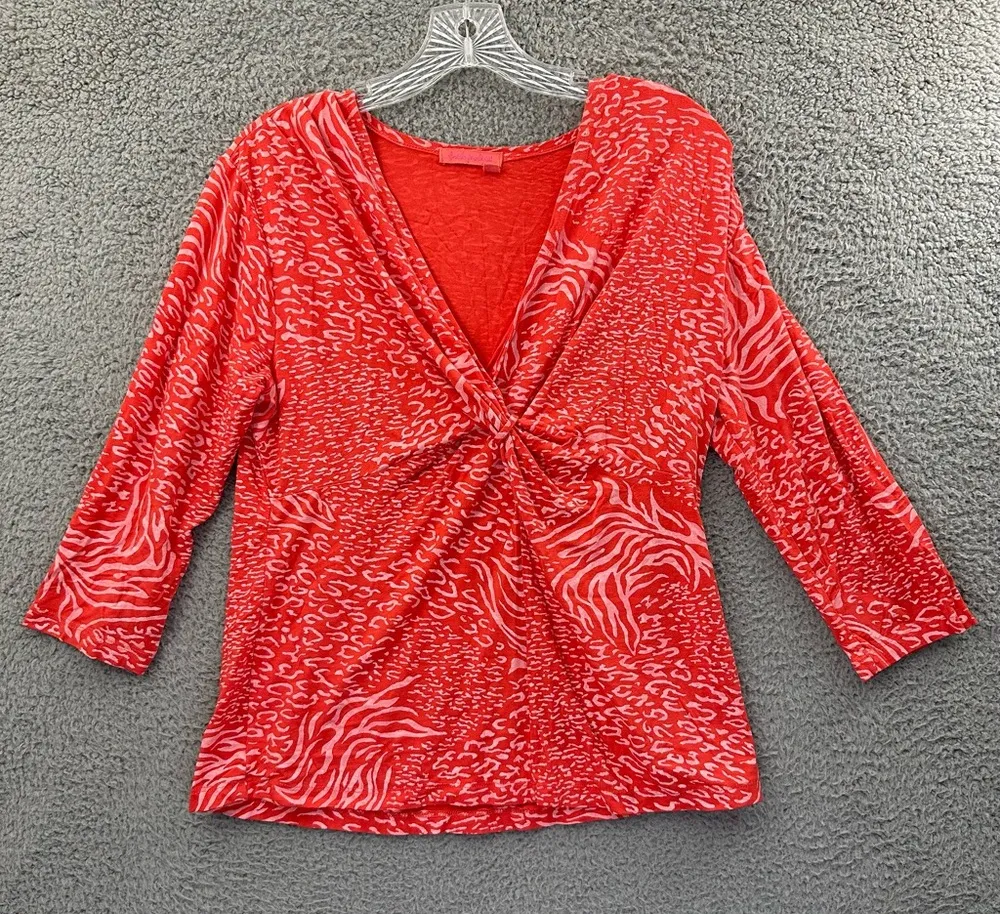 Fresh Produce 3/4 Sleeve Knotted Mixed Animal Prints Top Coral Women's M Pullover V Neck 3/4 Sleeve... Show more