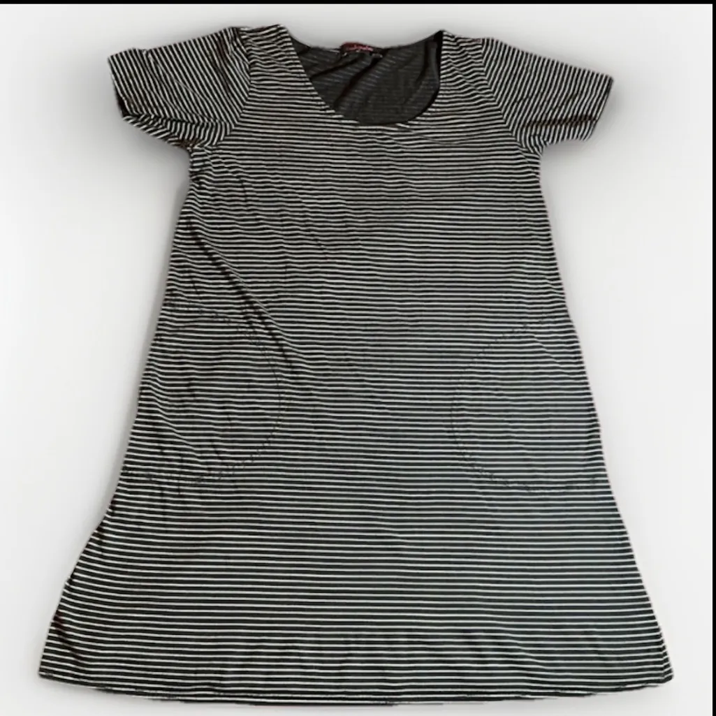 Condition: Good. Fabric shows gentle wash wear Cotton Fresh Produce dress Black and white horizont... Show more
