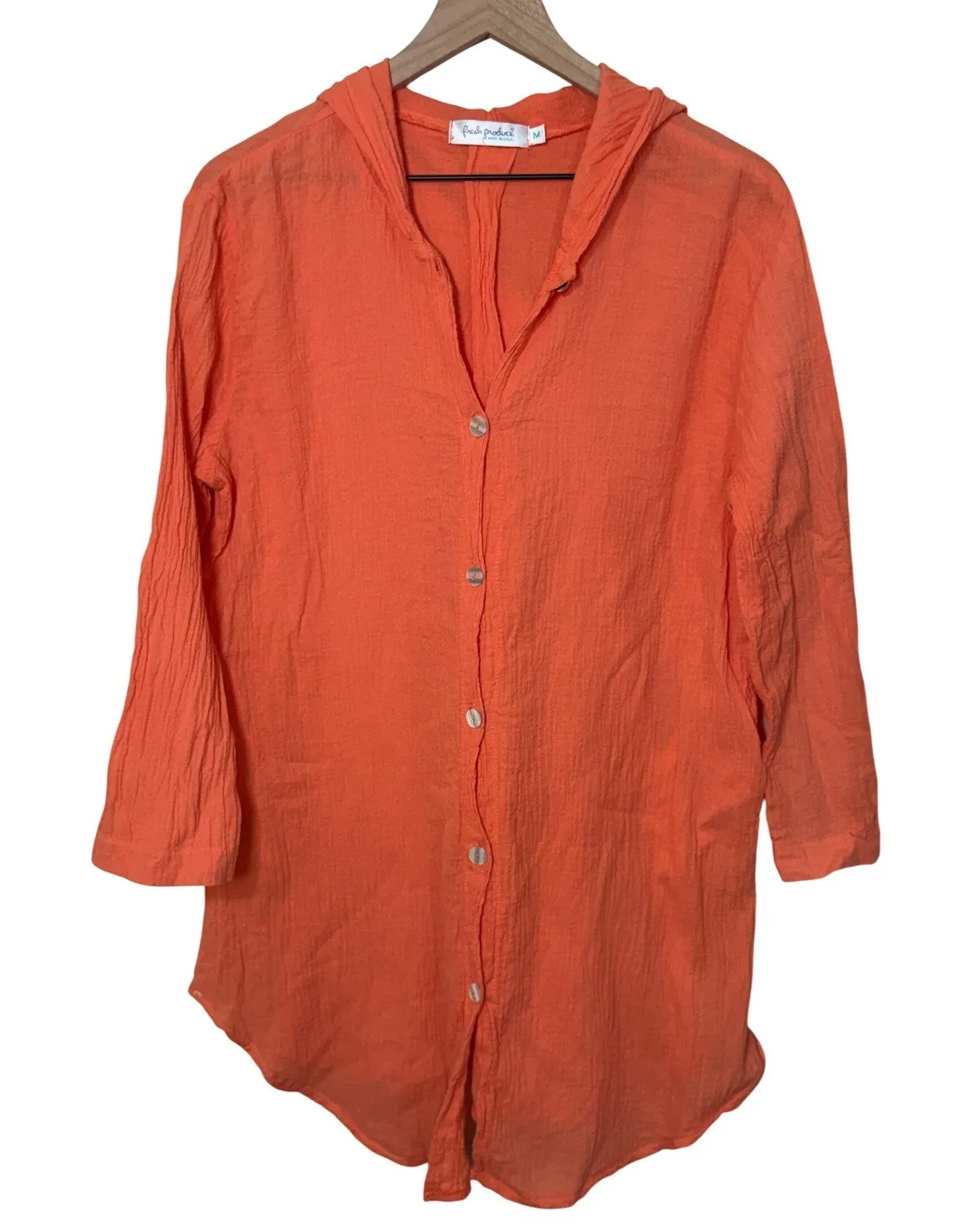 Fresh Produce orange sheer gauze tunic shirt with a hood and button-up front, medium. Measurements: • Length: 31 in • Bust (pit to pit): 21 in Good Pre-Owned Condition *any flaws will be noted above* ***Please make reasonable offers with the "offer" button (I won't negotiate in comments, no transactions offsite, no trades)**** • All items come from a smoke-free home. • Please compare the measurements to something you already own. Keywords: Tunic, Gauze, Hooded, Button Up, Lightweight, Casual, Beach Cover Up, Vacation Wear, Comfortable, Pullover, Orange Shirt, Women's Tunic, Resortwear, summer, beachy, pool, vacation