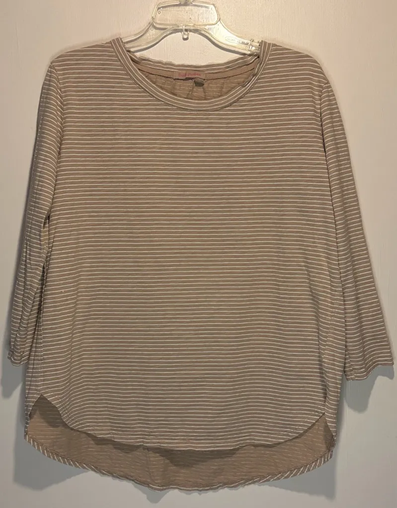 Stylish tan top with white stripes. Features Fresh Produce branding. Length- 25” front 28.5” back P... Show more
