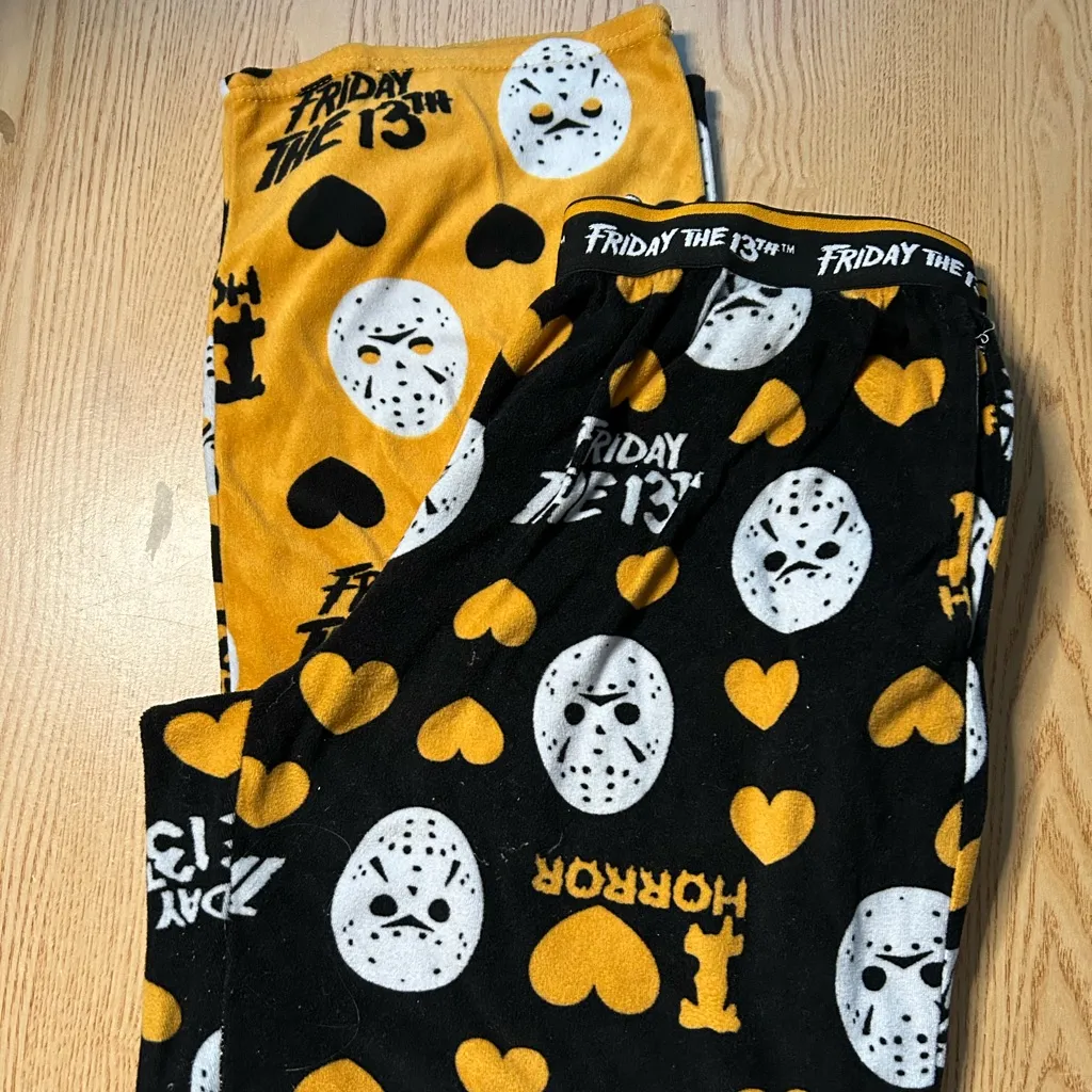 Friday the 13th 💀Women's Fleece Pajama Pants Black white & faded Orange size Medium 8-10 Cozy up in these Friday the 13th pajama pants featuring a bold black and orange design. Perfect for a comfortable night's sleep or lounging around the house. Note the small tear in the back by the tag Not noticeable at all Doesn’t affect anything Perfect for Halloween 👻
