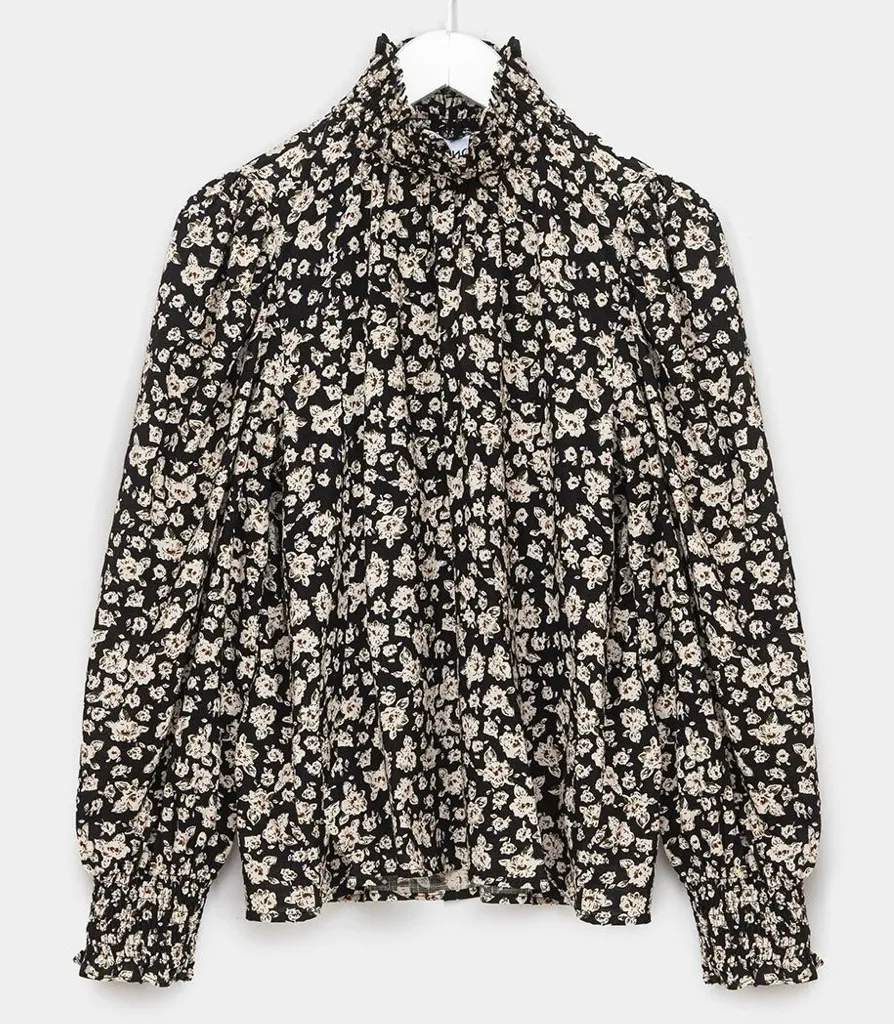 - Great condition! No noticeable flaws - Measurements (approximate & taken laying flat): Pit to pit: 19” Shoulder to hem: 23.5” - Sold out online - Pretty 70s inspired blouse from FRNCH with a ruffle high neck and puff sleeves in a black floral print. Pair with your favorite jeans or make it a set with the matching skirt. - 100% Viscose - Feel: lightweight soft, silky weave