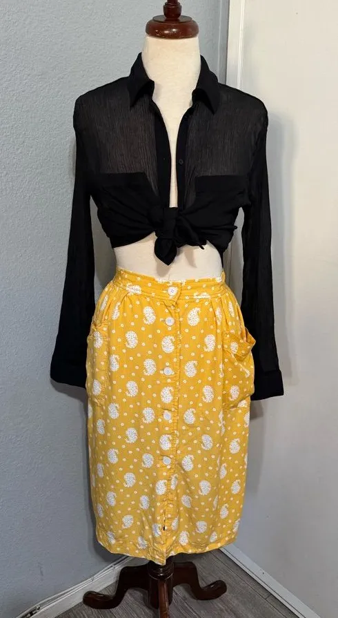 Add a sunny flair with this FRNCH skirt. Features a delightful floral pattern. Ideal for casual outings. Features: -High waisted -Buttondown -Two front pockets -Soft and fresh fabric Preowned - Good condition Brand: FRNCH Size: S Color: Yellow Made in PRC Fabric: 100% Viscose Estimated Measurements: Waist: 26in Length 25in 01