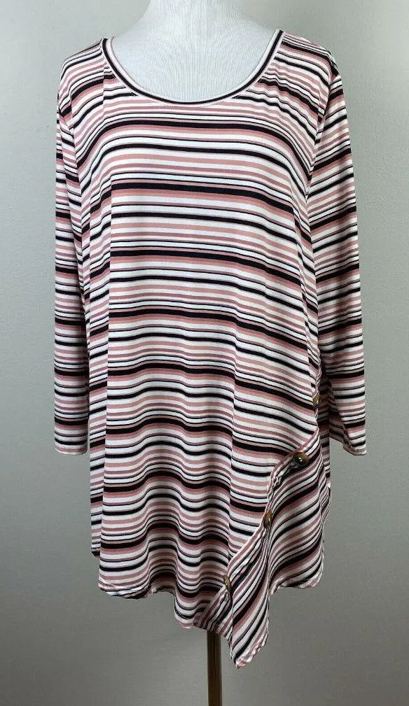 Como Blu Tunic Top 2X Stripe Asymmetrical Button Hem 3/4 Sleeve Multicolor Women's Plus Very good condition! 3/4 sleeve pullover tunic top. Multicolor stripes. Uneven hem with button detail. Lightweight material made of polyester and spandex. underarm to underarm: 25.75" length: 28-32.5"